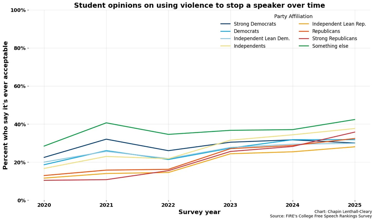Thirty-four percent of college students recently said they supported using violence in some circumstances to stop a campus speech, according to a poll from the Foundation for Individual Rights and Expression published a day before the Kirk shooting. Since 2021, that share has risen from 24 percent, which was already unacceptably high. Surveys of older adults are similarly alarming.