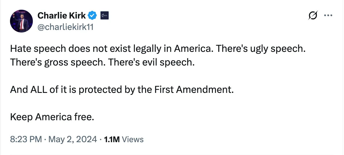 The irony, of course, is that this is all ostensibly being done in response to — and in some cases, in honor of — Charlie Kirk’s death…but Kirk himself decried the idea of hate speech laws, and would likely disagree with all of this behavior.