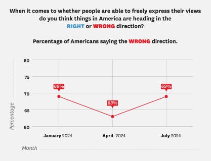 Half of Democrats — but only one-fifth of Republicans — think America is on the right track when it comes to free speech.